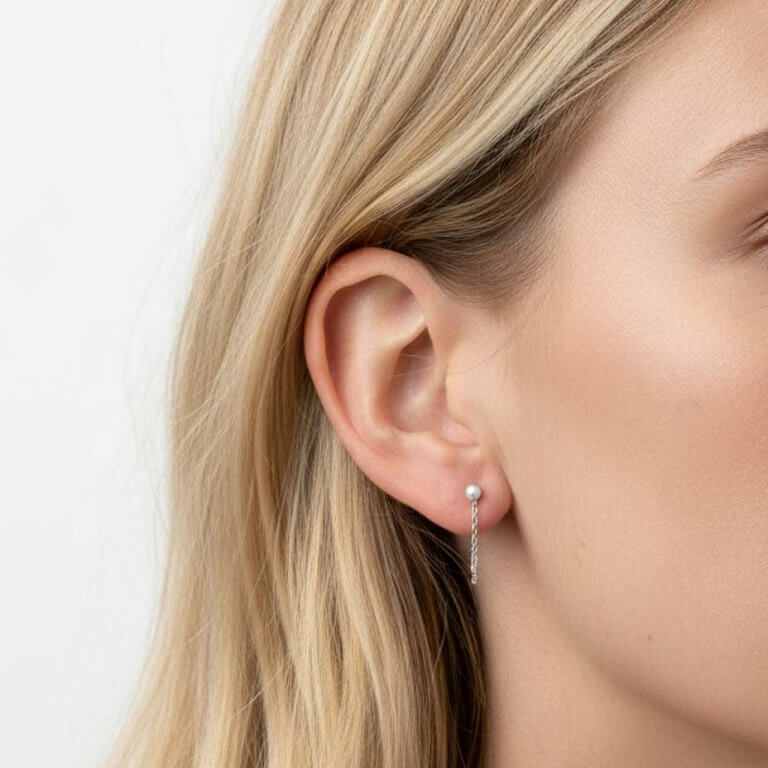 Søde små ørestikker med en skøn behind-ear effekt. Forrest på stikken sidder der en smuk hvid ferskvandsperle. Fra denne forløber der sig et kædestykke om til møtrikken. Kombinér dem med andre skønne øreringe fra Hultquist for maksimal effekt.