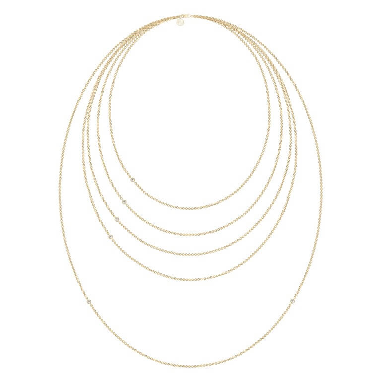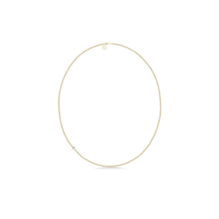Halskæde i 22 karat forgyldt 925 sterlingsølv med facetslebne kubiske zirkoniaer. Halskæderne fås i følgende længder 40 cm, 45 cm, 50 cm, 60 cm og 80 cm. Længde 40 cm til 60 cm er med 1 kubisk zirkonia. Længde 80 cm er med 2 kubiske zirkoniaer.