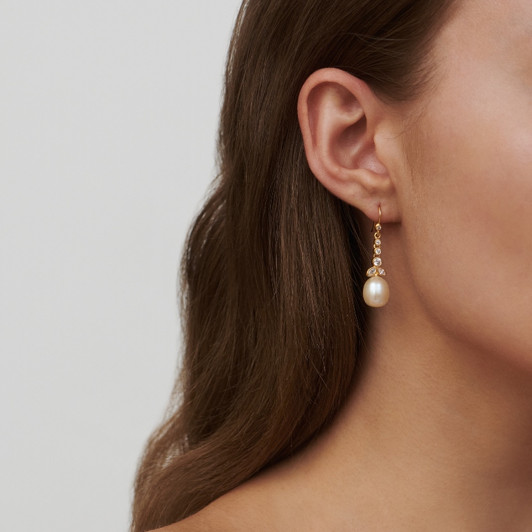 Disse fortryllende øreringe kan tilføre et strejf af magi til ethvert look. Øreringene er produceret i 22 karat forgyldt 925 sterling sølv og bærer en unik kombination af blomsterede detaljer af håndsatte zirkoner og sirlige, hvide ferskvandsperler i dråbeform.