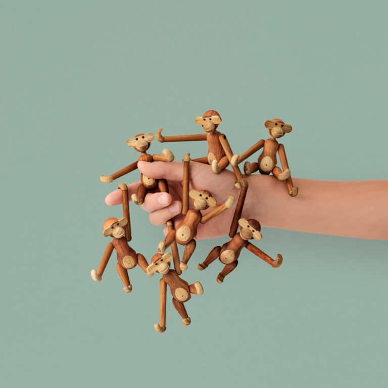 Aben er fremstillet i plantage teaktræ og i limbatræ, og trods sin størrelse har den lille abe selvfølgelig lige så meget karisma og charme som de ældre Kay Bojesen-aber i søskendeflokken. Da teak træet er plantageteak, kan der forekomme mørke pletter og striber, som med tiden vil mindskes, grundet lys og luft. Derfor vil der være forskelle i træet fra abe til abe, der gør hver eneste abe helt unik.
