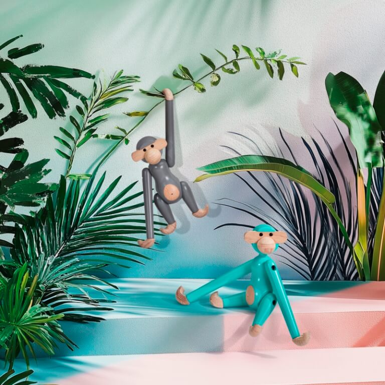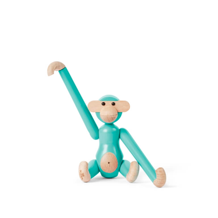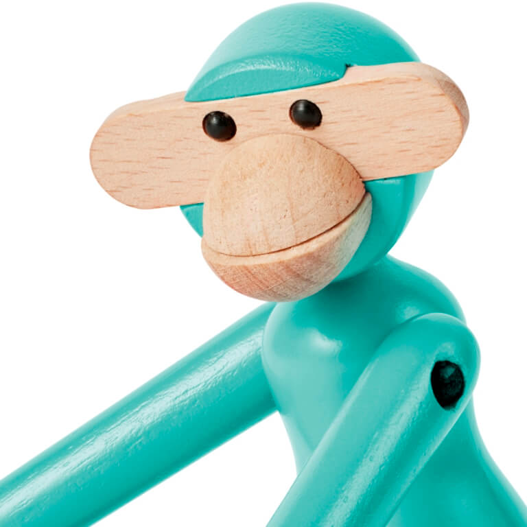 En både nostalgisk og nyskabende humørspreder. Kay Bojesens Abe har altid haft en farverig personlighed, og med den ikoniske miniabe i bøgetræ i nye og mere farverige klæder bygger vi ydmygt og med et glimt i øjet videre på Kay Bojesens designarv og skaber nye originale fortællinger i træ. Miniaben i turkis emmer af livsglæde og fremstår i et flot trendy look, hvor den både intense og rolige farve står smukt til bøgetræets kølige udtryk og er med til at fremhæve skønheden i træet. Den turkise farve hylder naturens dybe ro og evige afslappethed med himlens og havenes dæmpede, vandige nuancer.