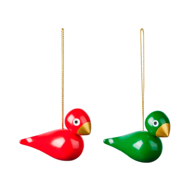 En elsket klassiker i dansk design smukt dekoreret til højtiden. Sangfuglene fra Kay Bojesen er højt værdsatte klassikere i dansk design. Og nu kan du pynte op til julens festligheder med de Kay Bojesen-julefugle i rød og grøn. Begge ophæng kommer med guldnæb og guldsnor og vil stråle originalitet og skabe en autentisk glæde fra toppen af juletræet, hængende på grene i vaser eller i det juleudsmykkede vindue.