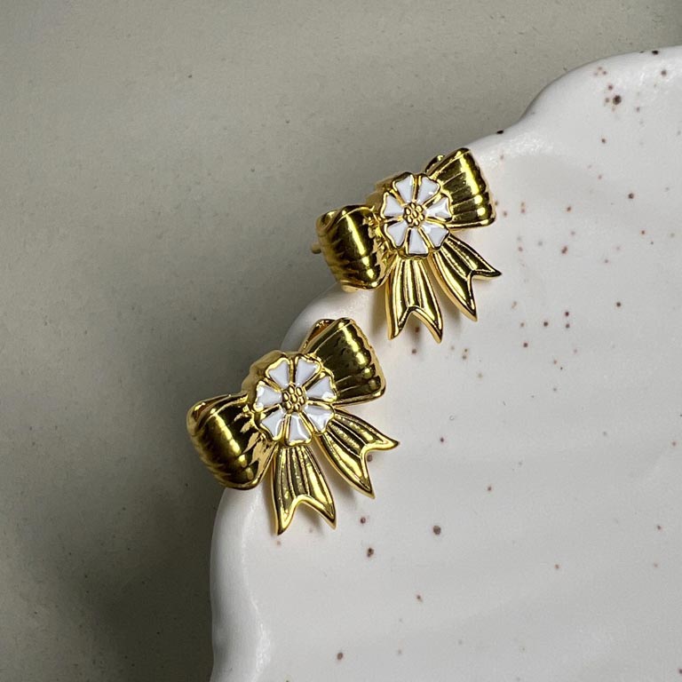 En skøn og elegant nyfortolkning af de klassiske margueritørestikker. Øreringene består af en klassisk margueritblomst (5mm) prydet med hvid emalje. Denne er isat i en naturtro sløjfe med blank overflade. Øreringene er udført i 925s sterlingsølv belagt med 24 karat guld.