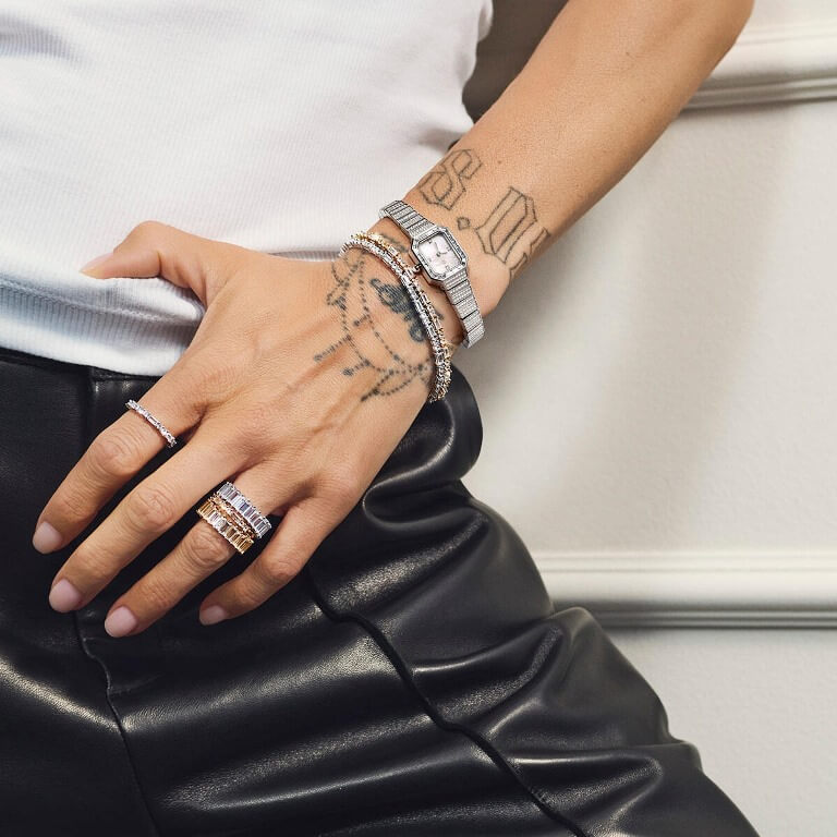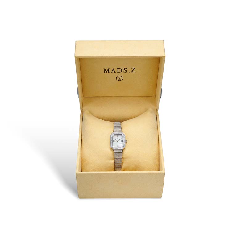 I et designsamarbejde mellem Medina og designer Mads Ziegler forenes dansk formsprog med schweizisk teknologi i Celestial by Medina uret. Tydelige, geometriske linjer møder en ottekantet lynette, mens iriserende perlemor og baguetteslebne sten refererer til nattens stjernebilleder. Urskiven indrammes af PVD-stål, og integreret lænke med zirkoniasten sikrer et helhedsindtryk af gennemført håndværk. Uret er en poetisk påmindelse om, at tid er dyrebar, forankret i den kompromisløse kvalitet fra safirglas og schweizisk urværk.