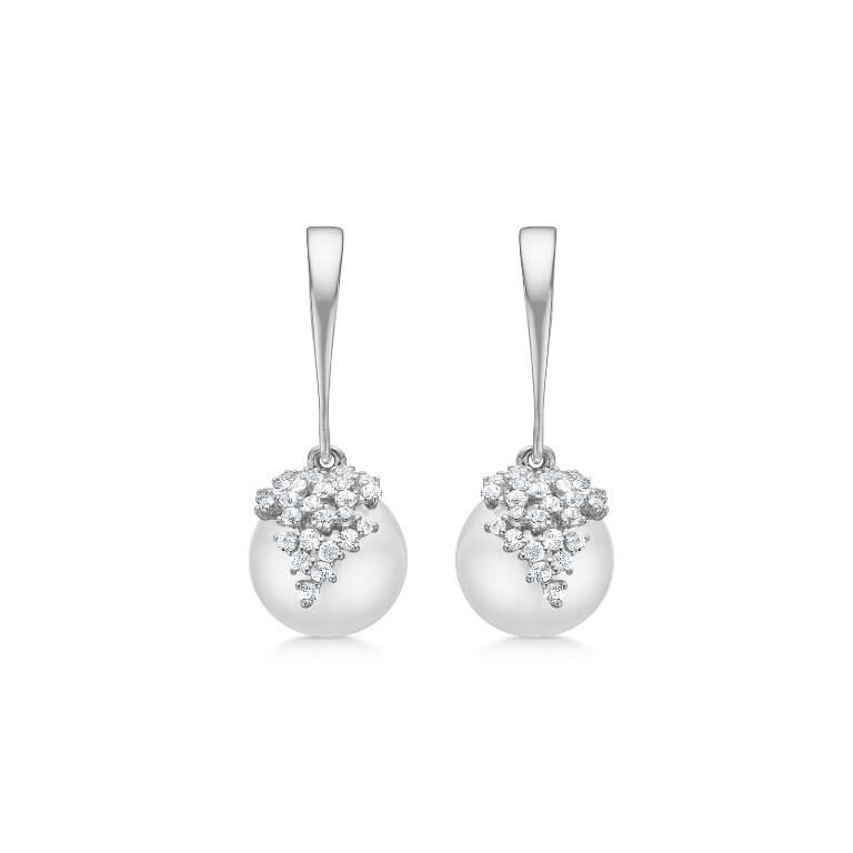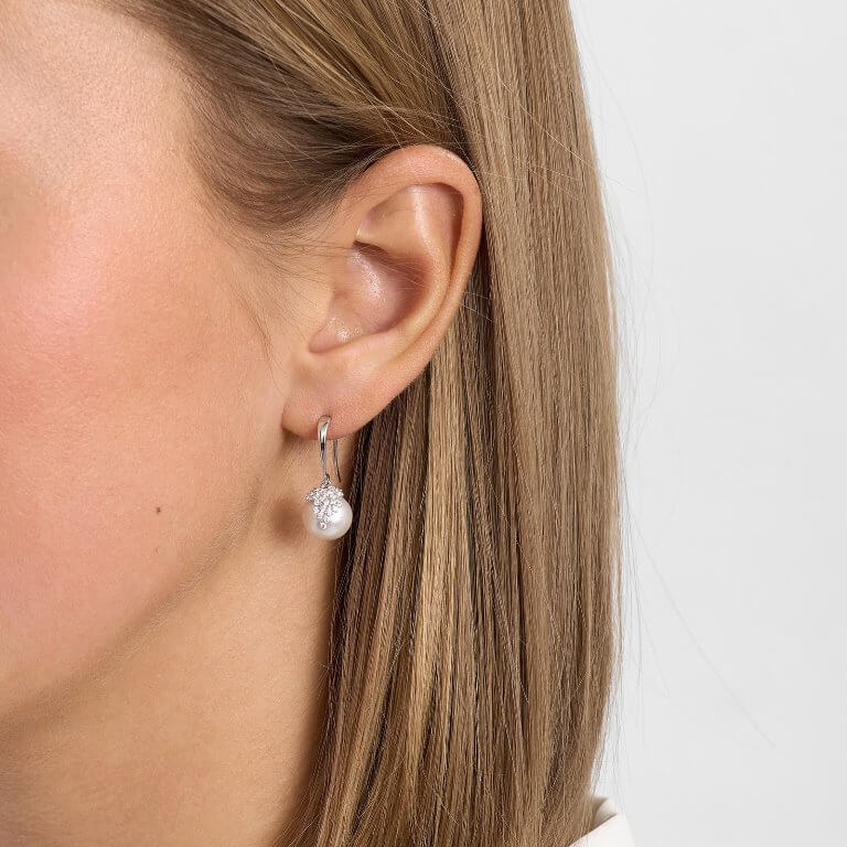 Chloé øreringe i poleret sterlingsølv med brillantslebne zirkonia og hvid kulturperle i dråbeformet, organisk design i dansk stil med harmoniske proportioner. Øreringene måler 10 mm.