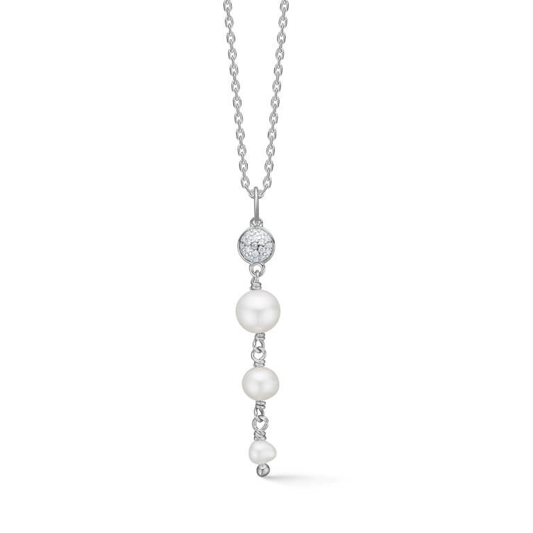 Dome halskæde i sterlingsølv med hvide kulturperler og facetslebne topaser – måler 35 mm i længden.