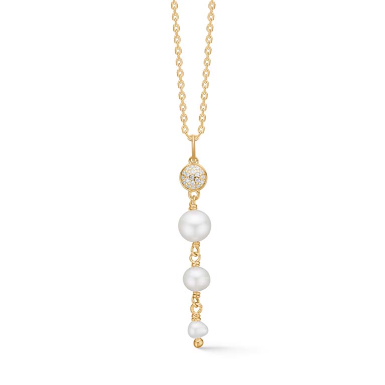 Dome vedhæng i 14 karat guld med hvide kulturperler samt 0,07 ct. brillanter W.SI. Vedhænget måler 35 mm i længden.