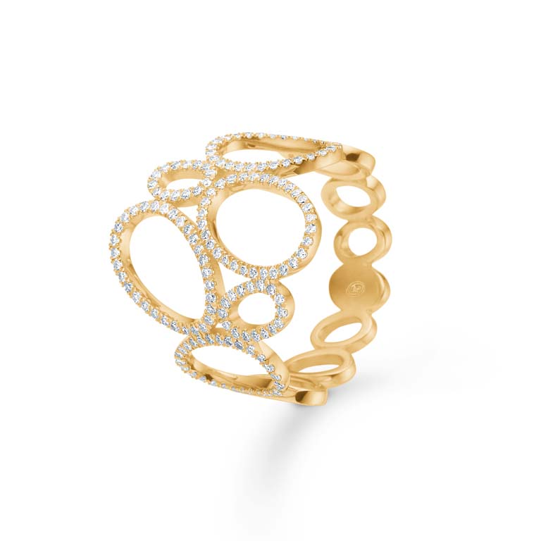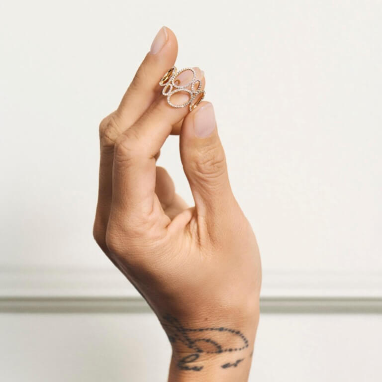 Designer Mads Ziegler udfolder en nutidig fortolkning af klassisk elegance med de rene, sammenflettede ovaler i denne komposition. De pavé-satte brillanter på 0.48 ct. W.SI fremhæver de flydende linjer og skaber varighed i udstråling. Formen fremstår let og balancerer harmonisk bevægelse med moderne finesse. Udviklet med præcision og øje for detaljen, er Evaya et signatursmykke med både tilstedeværelse og raffineret håndværk, målrettet den stilbevidste kvinde, der søger varig værdi i et eksklusivt design.