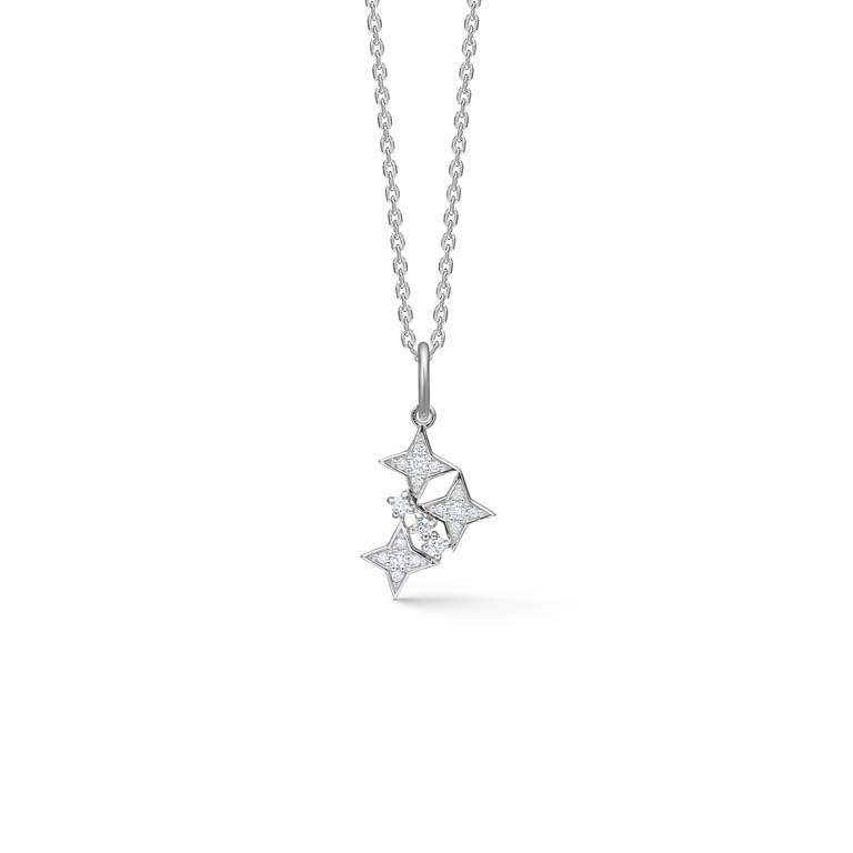 Chefdesigner Mads Ziegler fandt inspiration i skumringens øjeblik, hvor lys møder mørke. Kontrasten mellem dag og nat omsættes til Vesper-halskædens asymmetriske stjerne, hvor facetslebne hvide topaser fanger lyset i det geometriske design. Hvert element er udført med opmærksomhed på detaljen og høj guldsmedekvalitet; samspillet mellem former og ædle materialer skaber et signatursmykke for den stilbevidste kvinde.