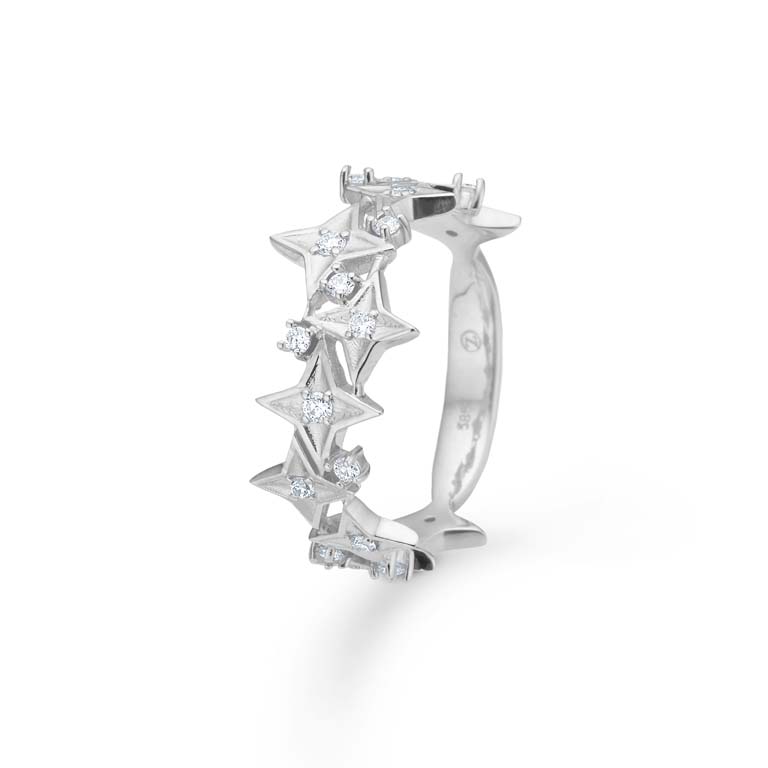 Vesper ring i sterlingsølv med hvide topaser. Et moderne design, hvor stjerneformede led og elegante linjer mødes i en grafisk komposition, der kombinerer ædle materialer med funktionel komfort.