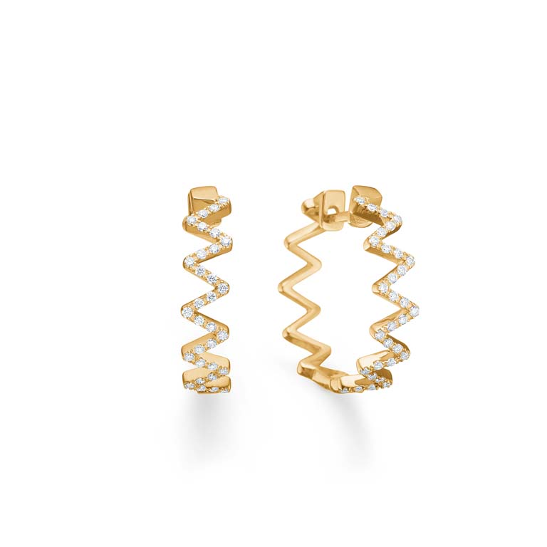 Designer Mads Ziegler forener skarpe former med ædle materialer i Vianna. De vinklede bøjninger skaber kontrast mellem den arkitektoniske zigzagstruktur og det glatte, polerede guld, så øreringen fremhæver bevægelse og refleksion. Langs midtersegmentet accentueres linjeforløbet af en præcis pavérække på 0,20 ct. brillanter W.SI, som følger profilens knæk og tilfører øreringen et diskret, rytmisk lys. Hver detalje er udført med fokus på kompromisløs kvalitet, som kendetegner Gold Label.