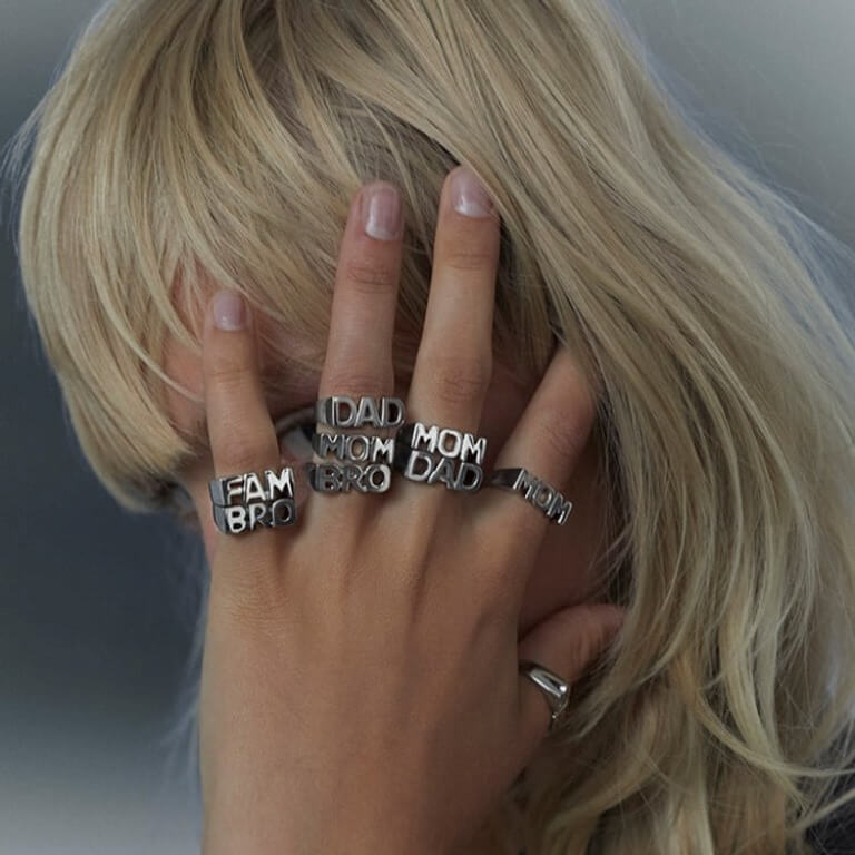 BRO signet ringen er eksklusivt udformet i genanvendt sterlingsølv med hvid rhodium belægning. Ringen har en moderne tekstfont der gør den stilren og tidløs i designet.