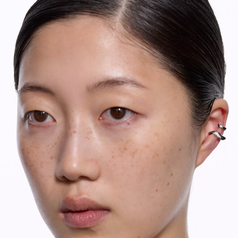Smuk dobbelt ørecuff med illusion detalje. Denne cuff sidder halvejs rundt om øreflippen og hviler på conch. Detaljen smøger sig opad venstre øre og nedad højre øre og cuffen er særligt velegnet til at blive stylet med flere øreringe. Øresmykket er udført i recycled sterlingsølv belagt med hvid rhodium.