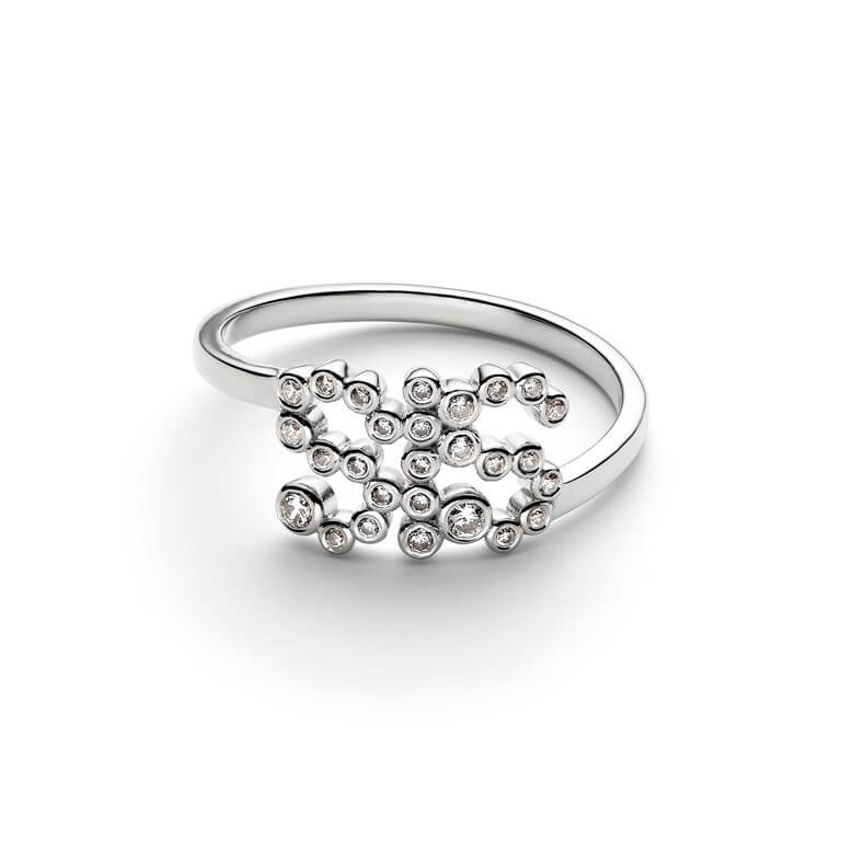 - Bogstaverne er formet af 27 hvide, brillantslebne zirconia-sten i graduerede størrelser sat i rammefatninger.