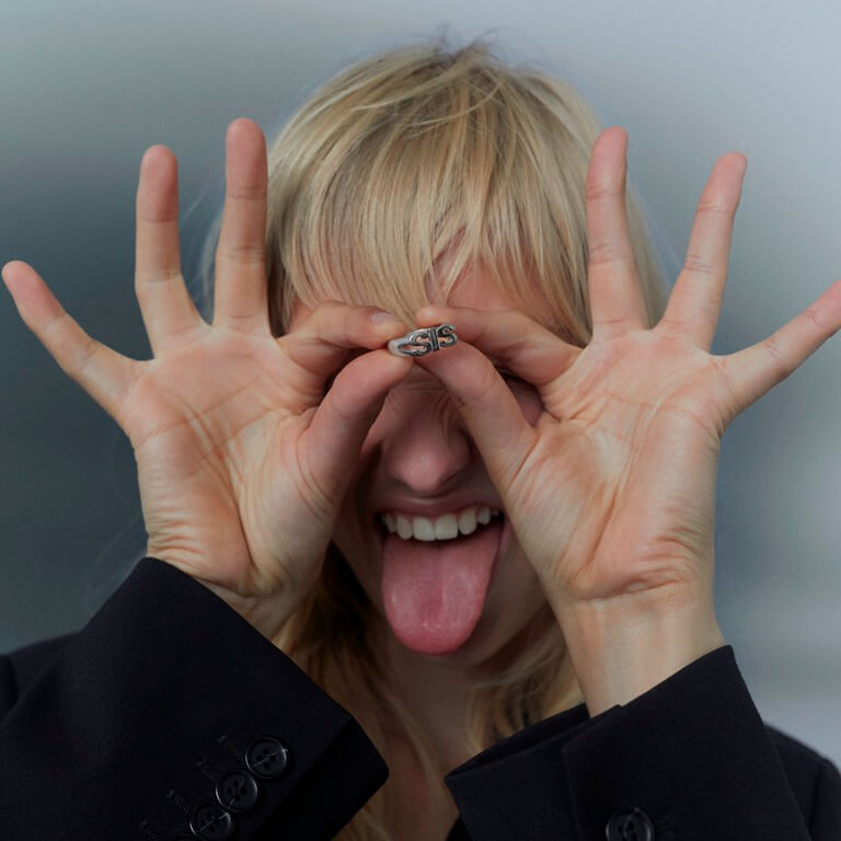 SIS signet ringen er eksklusivt udformet i genanvendt sterlingsølv med hvid rhodium belægning. Ringen har en moderne tekstfont der gør den stilren og tidløs i designet.