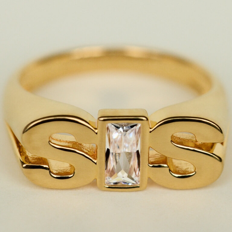 - Sis signetring med baguette hvid zirkonia sten indlagt i I'et.