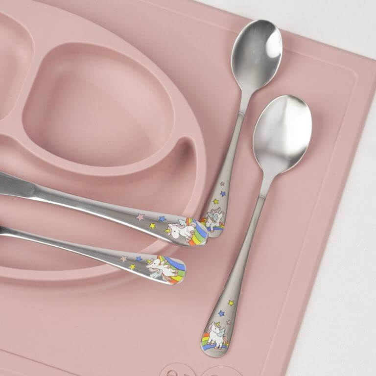 Sødt bestiksæt til de mindste, pyntet med farverige emaljebilleder. Bestikket er udført i rustfrit stål og tåler maskinopvask.