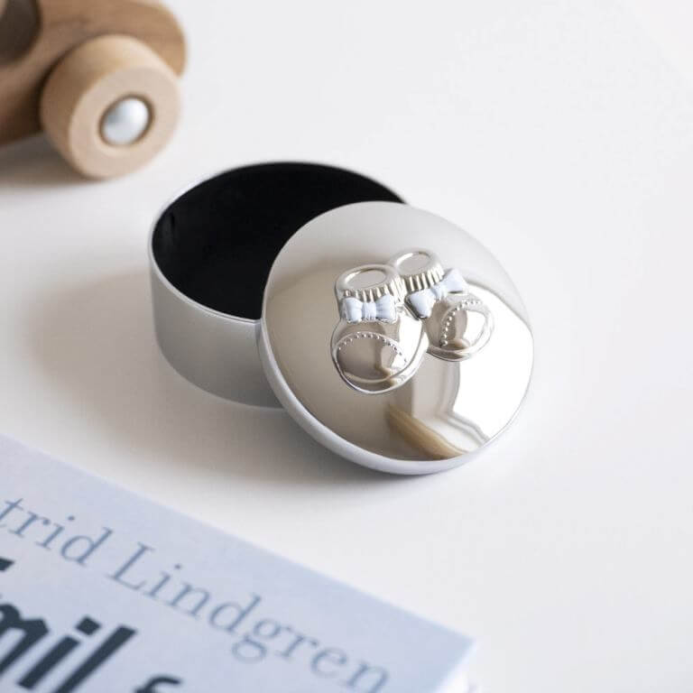 Sødt lille skrin i forkromet blank stål. Låget er pyntet med et par små sko dekoreret med lyseblå emalje.