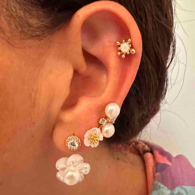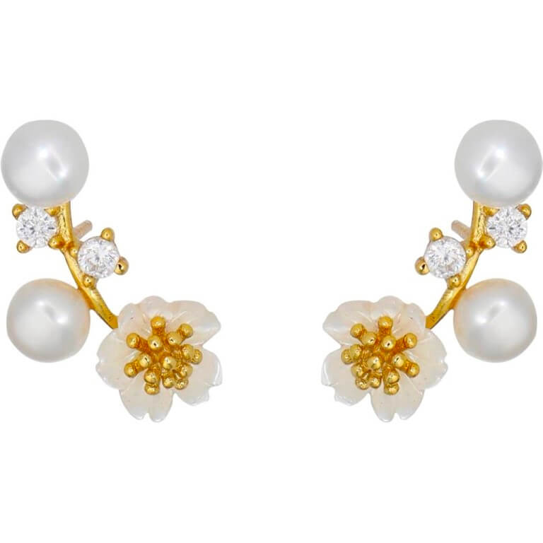 Amina øreringene er et par fine ørestikker der emmer af elegance. Øreringene består af en smuk samling af zirkonia-sten, ferskvandsperler og skalperler. Øreringene er både smukke alene og kravler magisk op ad øreflippen.