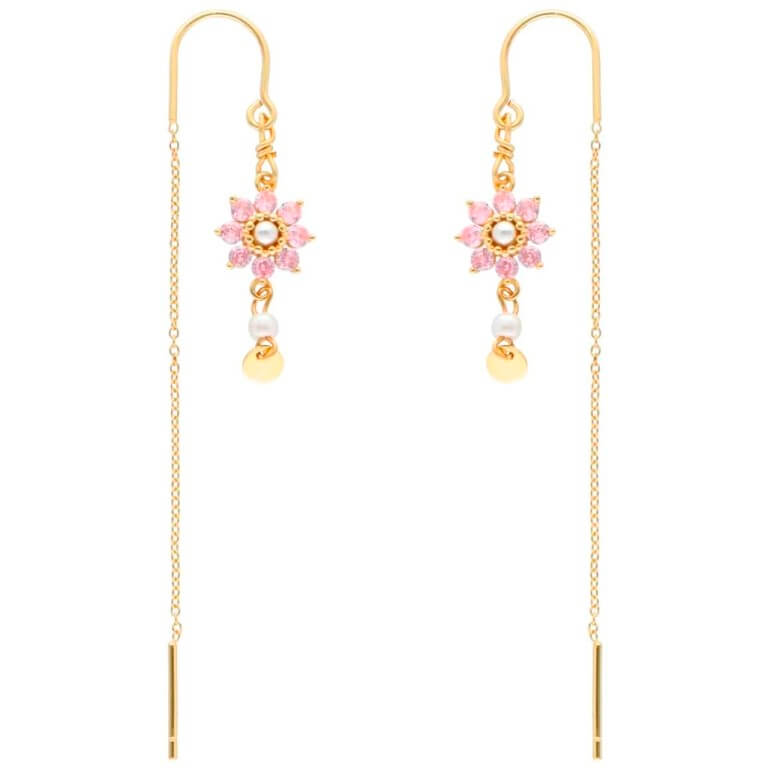 Flora Pink er et par smukke og farverige kædeøreringe med masser af liv. De er prydet med pink zirkonia-sten som danner en blomst. I midten af blomsten sidder der en skøn hvid ferskvandsperle omsluttet af forgyldte kugler, som matcher perlen og møntvedhænget nedenfor.