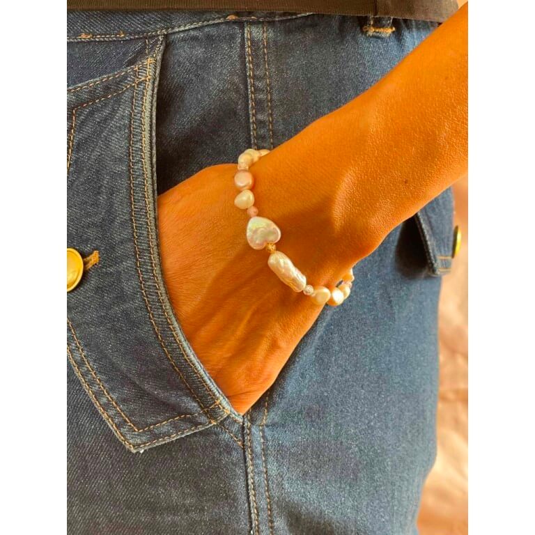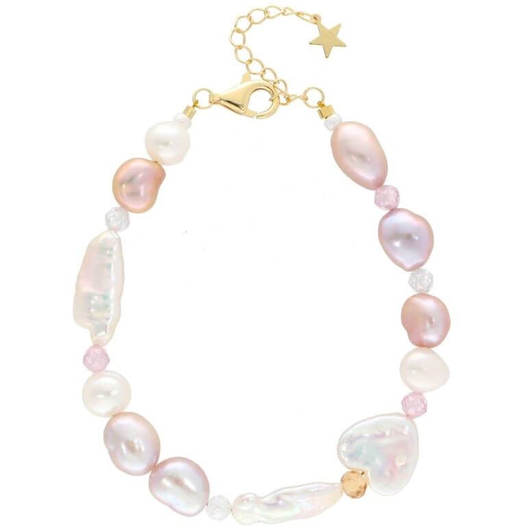 Nadine armbåndet er et farverigt og kærligt statement-armbånd udover det sædvanlige. Det er udført i 24 karat forgyldt genanvendt sterlingsølv 925 og er prydet med farvede zirkonia-sten samt runde, aflange og hjerteformede ferskvandsperler i forskellige nuancer.