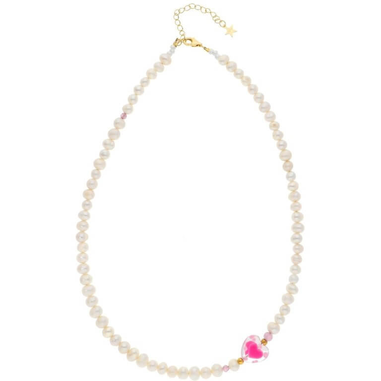 Rosalia er en smuk og farverig håndlavet halskæde i 24 karat forgyldt genanvendt sterlingsølv 925 prydet med hvide ferskvandsperler og glasperler.