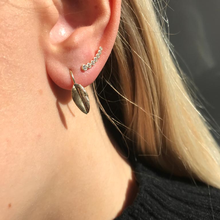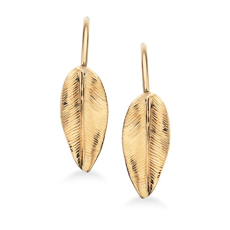 Disse Scrouples ørebøjler er et mesterstykke af naturinspireret elegance, udført i fint 8 karat guld med en detaljeret struktur, der efterligner bladets fine årer. Denne smukke repræsentation af naturens skønhed er et udtryk for håndværk og design, og den tilføjer en organisk, men raffineret touch til dit udseende.