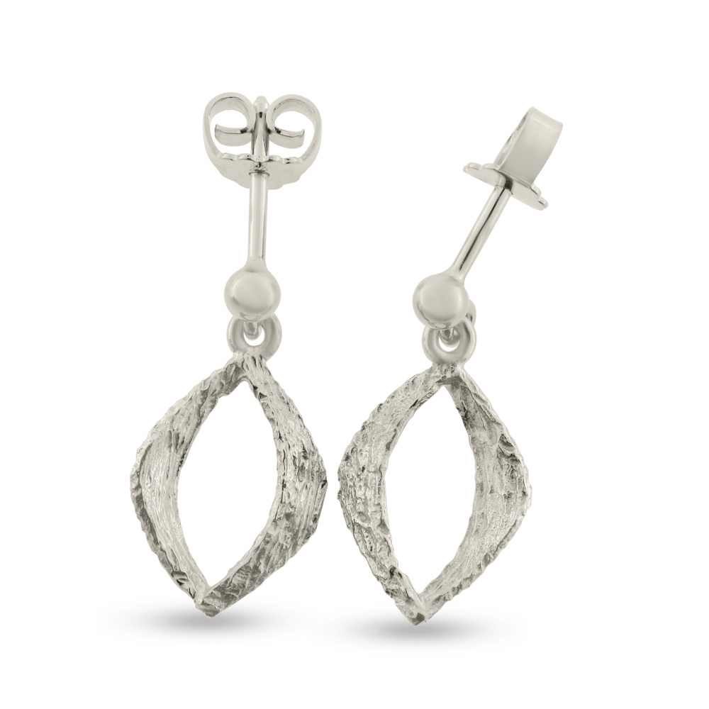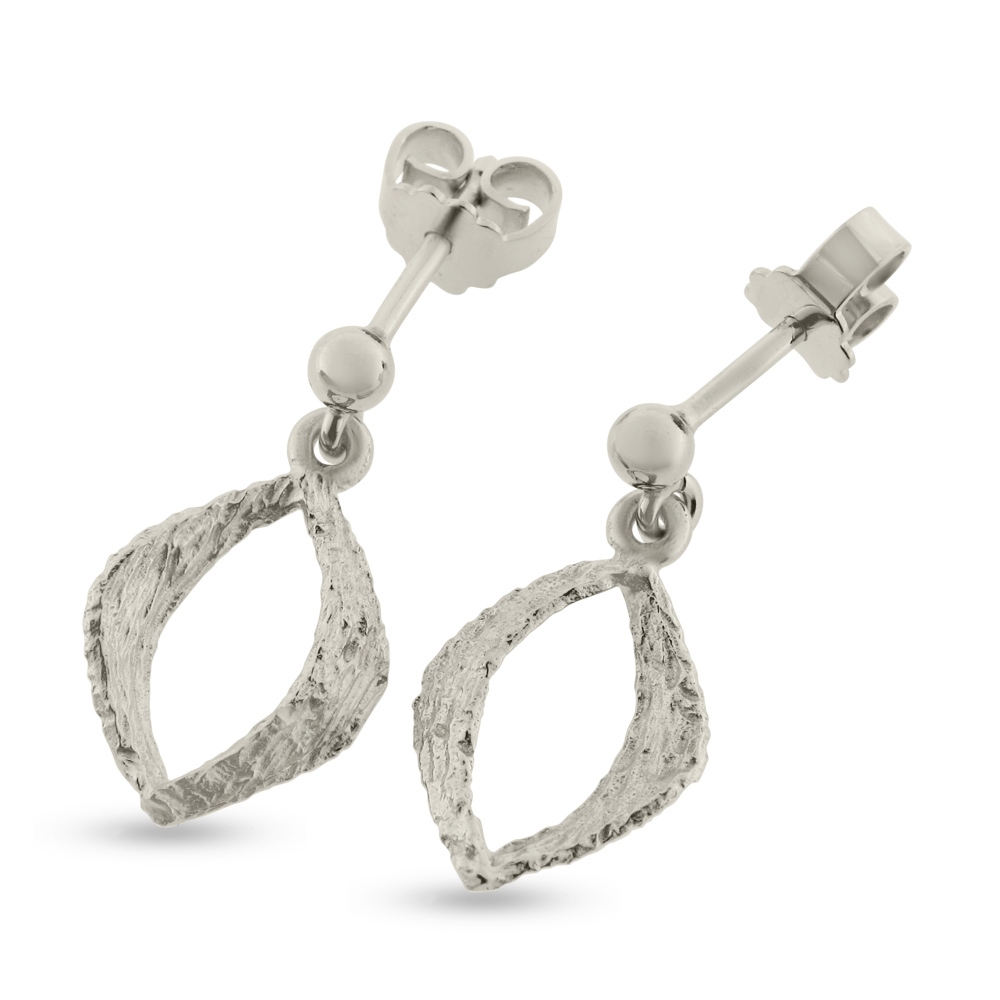 Elegante øreringe i massiv sølv, hvor der fra et par kugleørestikker hænger nogle smukke og bevægende vedhæng. Øreringene har en barket overflade der tilføjer noget råt men også elegant til deres endelige udtryk.
