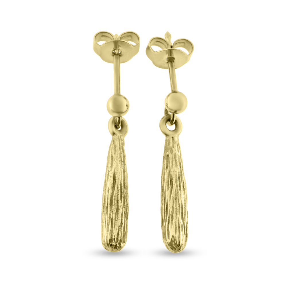 Elegante øreringe i massiv guld formet som et par dråber med en barket overflade som tilføjer et råt og dynamisk udtryk.