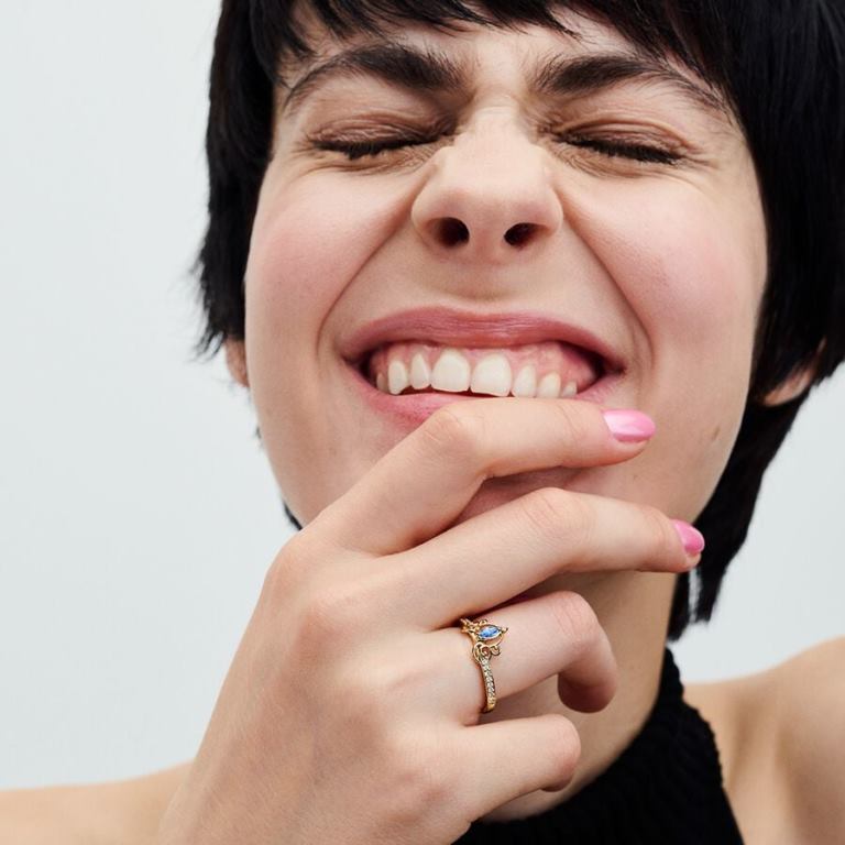 Gør dig klar til et bal med Disneys Askepots karet-ring med en blå marquiseformet sten i midten. Hvirvlende openwork i 14 kt. guldbelægning danner det fortryllende karetmotiv og forbindes med ringbåndet, der er indfattet med funklende klar kubisk zirkonia pavé på halvdelen af båndet.