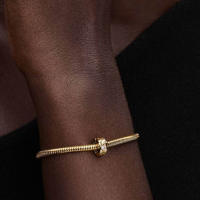 Smil fra øre til øre. Pandoras Mickey og Minnie Mouse-klemmeled er belagt med 14 kt. guld og indfanger magien fra to Disney-symboler. Det er indfattet med funklende sten, der tilfører en magisk finish.