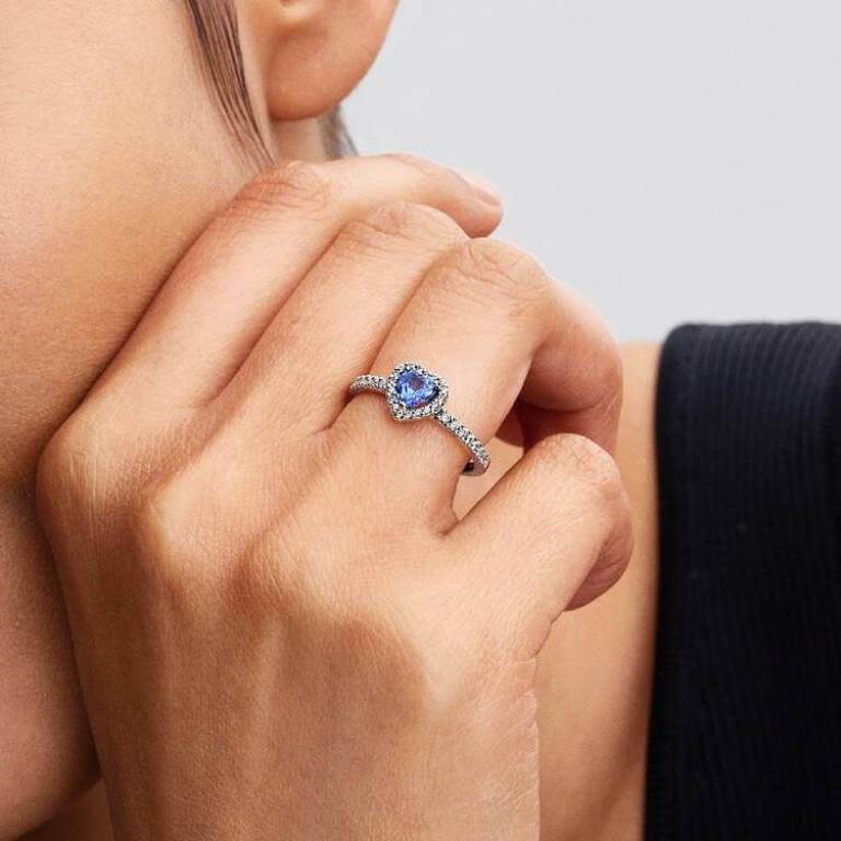 Denne ring består af en blå, hjerteformet syntetisk krystal, der er slebet til perfektion, omgivet af en halo af pavé. Bær den som et symbol på hengivenhed og elegance.