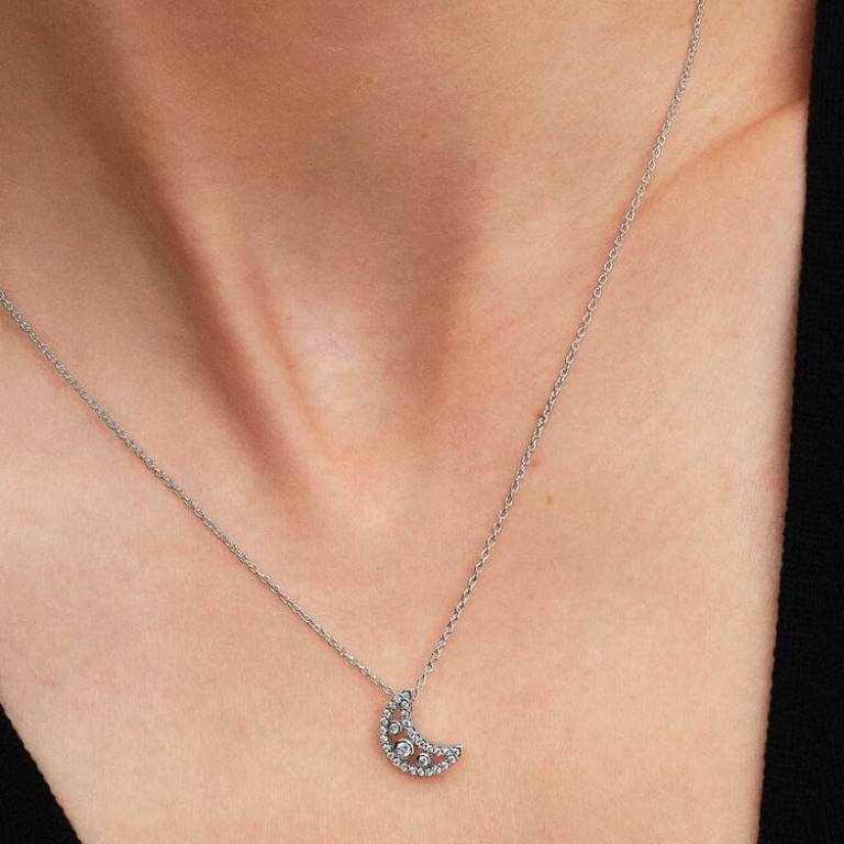 Bær nattehimlens vidunder. Denne halskæde i sterlingsølv består af en åben halvmåne, der er indfattet med funklende kubisk zirkonia. Hvis du kigger nærmere, vil du se, at der også hænger en miniversion på låsen.