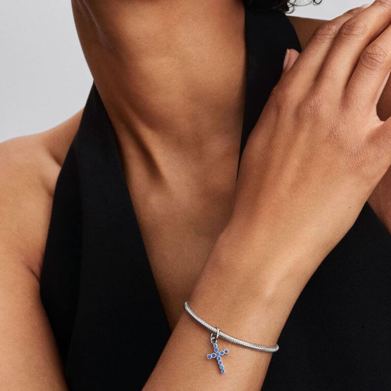 Tro tager form med dette universelle symbol på håb og kærlighed. Blå syntetiske krystaller danner et funklende kors indfattet i køligt sterlingsølv – et meningsfuldt smykke, der stråler alene eller stablet med andre.