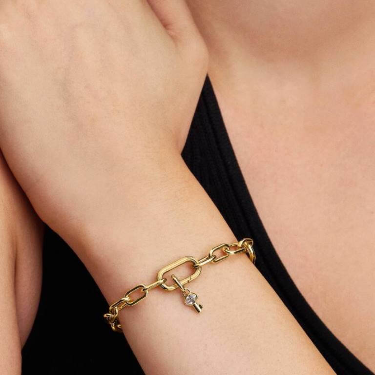 Hent dit nye sæt nøgler. Pandoras 14 kt. guldbelagte minicharm med vedhæng har en klar kubisk zirkonia på den ene side og en udskåret stjerne på den anden, der låser døren op til dit næste look. Minicharmet passer til både Pandora ME og Pandora Moments.