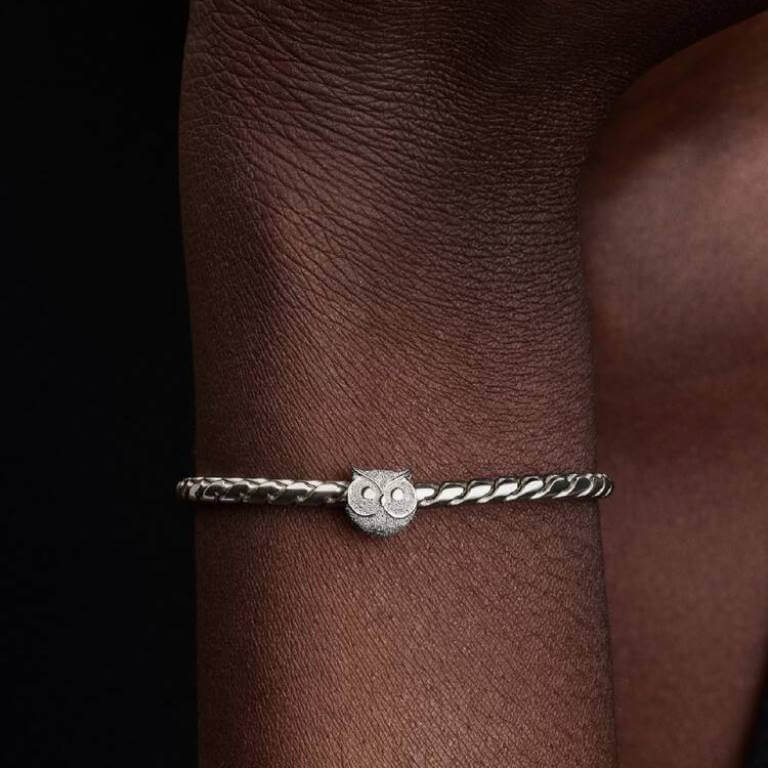 Klog og kær. Dette ugle minicharm i sterlingsølv har en diamantspids tekstur, der kombinerer viden og intuition med hverdagselegance.