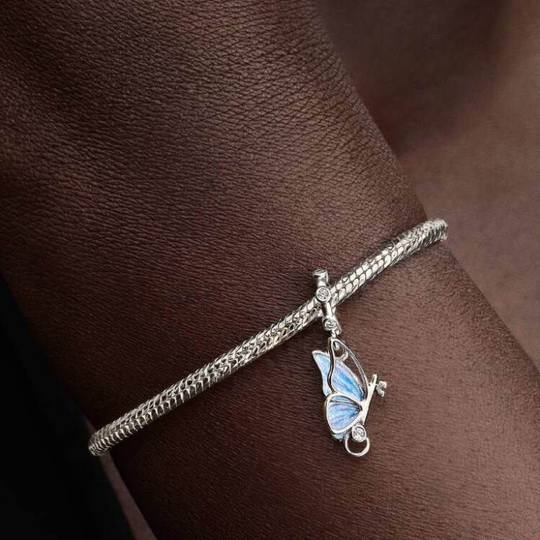 Lås dine drømme op med Pandoras Vinger Charm i sterlingsølv. Sommerfuglens hoved og krop danner en nøgle. Den ene vinge har et åbent design, mens den anden er dekoreret med skinnende emalje og indgraveringen "UNLOCK TOMORROW".