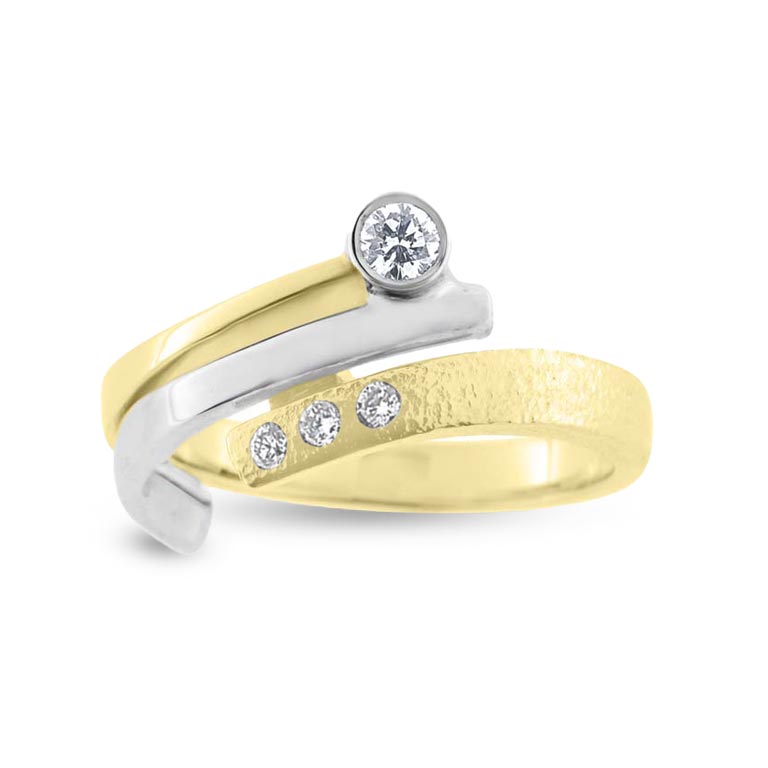 Ring brill. 0,05 w/vs + 3* 0,02 w/vs. skinne gul, pynt hvg. 14 kt.