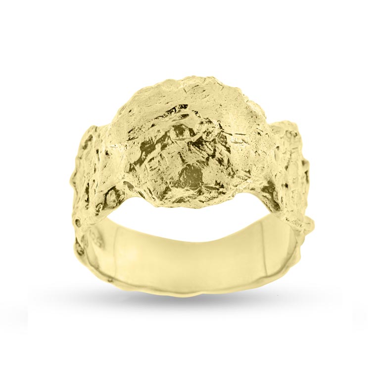 Ring råsølv forgyldt rund topplade, rå struktur, br. top 11,8 mm.