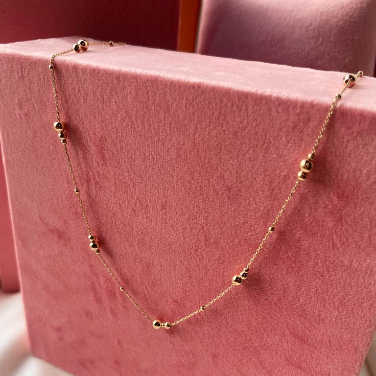 Denne halskæde fra Scrouples i 8 kt. guld har et let og elegant udtryk med små kugler placeret med fine mellemrum langs kæden. Det giver et roligt og feminint look, som er nemt at kombinere med resten af din smykkesamling.