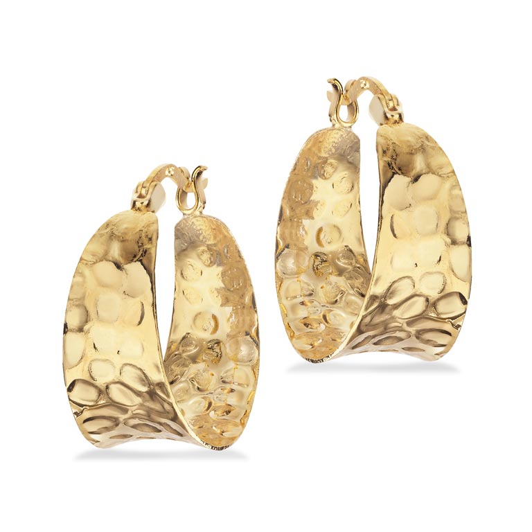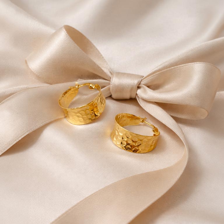 Et par markante halvcreoler fra Scrouples i forgyldt sølv med en rustik, hamret overflade. Det ujævne mønster giver et levende spil i lyset og tilfører et råt, men stadig elegant udtryk.