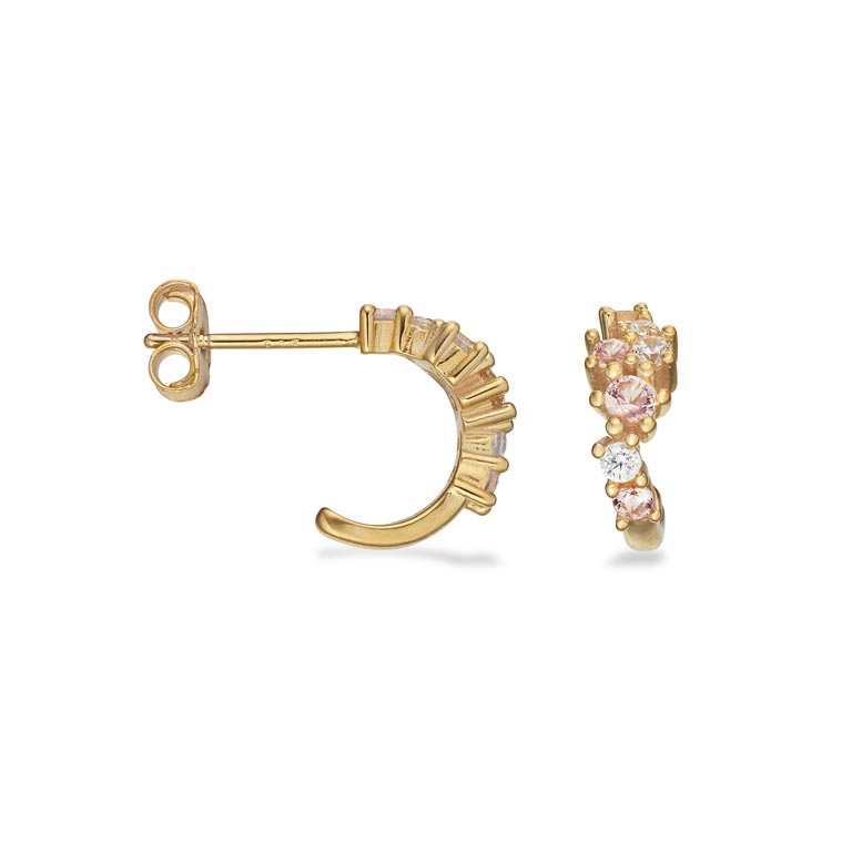 Elegant halvcreol i forgyldt sterlingsølv med fine zirkonia i rosa og hvid. De små sten er sat i en let buet række, som giver et blødt og feminint udtryk, der fanger lyset uden at virke prangende.