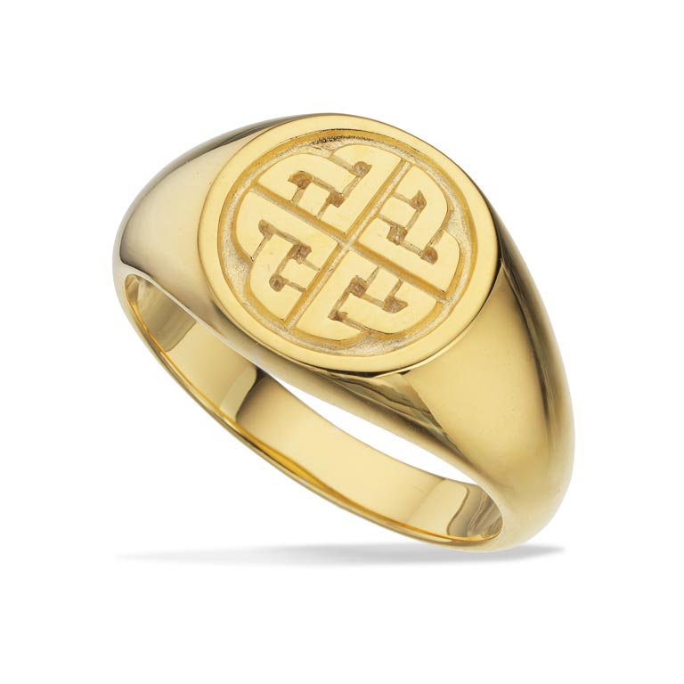 En markant herrering fra Scrouples i forgyldt sølv med et klassisk signetdesign. Fronten er dekoreret med et indgraveret mønster, der giver ringen et personligt og karakterfuldt udtryk.