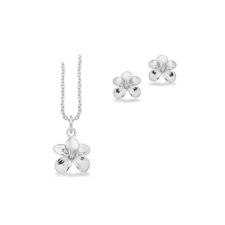 Sættet består af en fin halskæde med blomsterformet vedhæng samt matchende ørestikker, hvor hver blomst emmer af ynde og lethed. Det delikate design med fem afrundede kronblade og en diskret midte giver en sanselig og harmonisk fornemmelse.