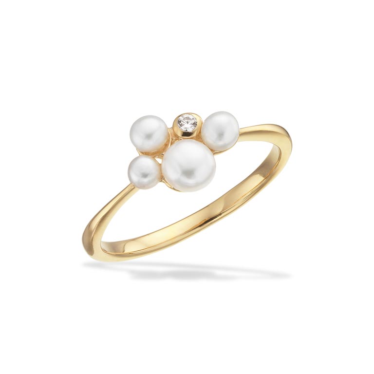 Fin og feminin ring i forgyldt sølv med ferskvandskulturperler og en klar zirkoniasten. De små elementer er samlet i en let asymmetrisk form, som giver et moderne og blødt udtryk.
