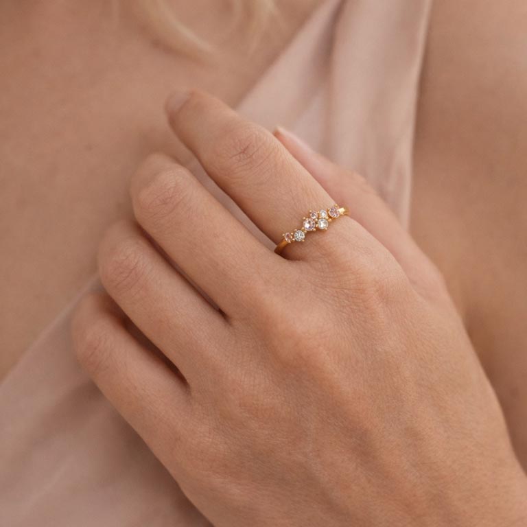 Fin og feminin ring i forgyldt sterlingsølv med zirkoniasten i rosa og hvid. De små sten er placeret i en let buet række, som giver et blødt og harmonisk udtryk med et diskret spil i lyset.