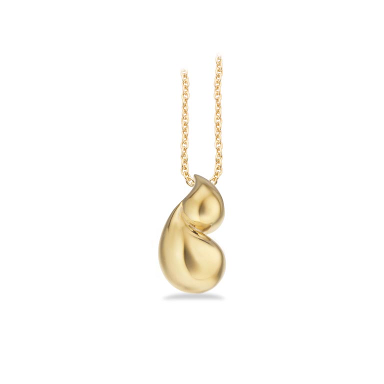 Dette vedhæng fra Scrouples i forgyldt sølv har et blødt dråbeinspireret design med organiske former, der flyder elegant sammen. Den glatte overflade giver et roligt og moderne udtryk.