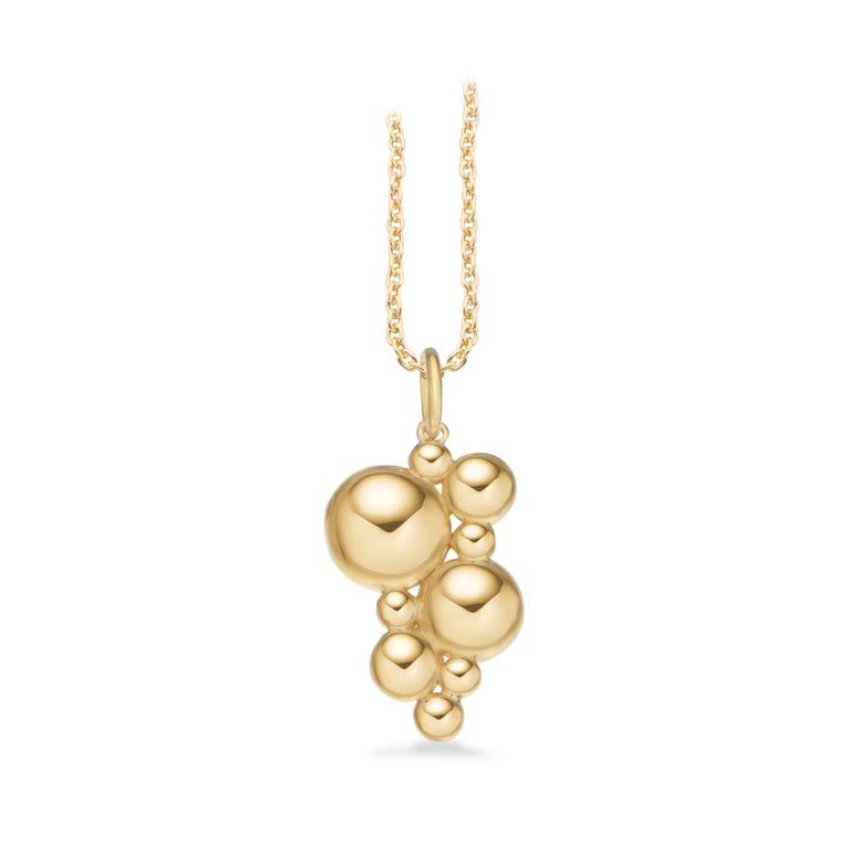 Et dekorativt vedhæng fra Scrouples i forgyldt sølv med et moderne design af samlede kugler i forskellige størrelser. De bløde former skaber et levende udtryk, der fanger lyset flot.