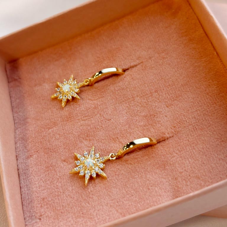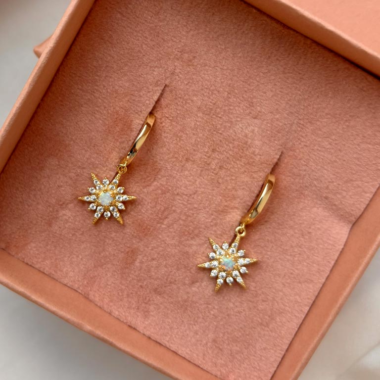 Disse funklende Scrouples SoHo clip-creoler i forgyldt sølv er et ægte statement-piece, inspireret af stjernens magiske udstråling. De strålende stjernevedhæng er besat med zirkoniasten og har en skinnende opal i midten, der tilfører et fortryllende farvespil.