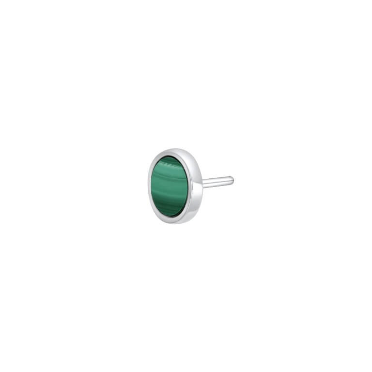 Smart rund ørestik i rhodineret sterlingsølv med en changerende grøn malakit sten.